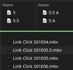 ls -1vsorts those files in the terminal, for example:Link Click S01E04.mkv Link Click S01E05.mkv Link Click S01E05.5.mkv Link Click S01E06.mkvNemo might be able to support version sort by way of a plugin, but I have not found one. The