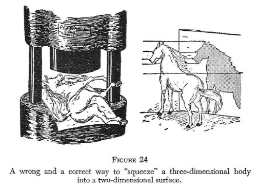 I believe that you’re thinking of squishing a bug. But that’s a very lossy projection. In its 2D state you only look at the topmost portion of the bug, which is recognizable. But you’re choosing to ignore the infinitely many points that make up all the other layers of the bug. If you had to put them somewhere, too, the resulting picture would be very hard to make sense of.