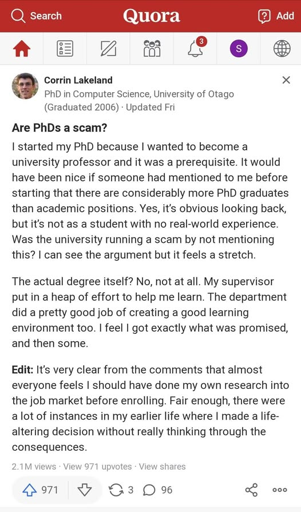they probably were, but it was OFUSCATED or they dont actually “address people on the issue” its also the same with undergrad and MASTERS level. the university benefits by not telling so they can keep the cash cows coming into as undergraduate, masters, or PHD. if they warned them in Undergrad, people will just not take a certain major, or dont even go the university altogether.