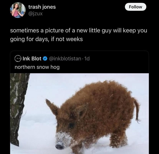 I think that must be a hog, but in the snow. Like a mammoth, for elephants. Or a woolly rhino for rhinoceroses. Or a fuzzypotamus for hippos. Or a hairy snail for snails.