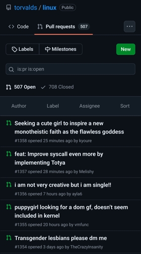 yogurtwrong@lemmy.world to Linux@lemmy.ml · 2 months agoLinux github repo is now a dating boardlemmy.mlimagemessage-square55linkfedilinkarrow-up1375arrow-down18