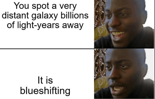 Something ominous about the post is that a cosmic object that is moving towards you at a steady rate is consided “blueshifted” in the past tense, it’s velocity is steady. If a galaxy is “Blueshifting” in the present tense, then that galzy is somehow accelerating at you, which is impossible unless it’s under direct control by an entity, presumably a kardeshev level 3 civilization.