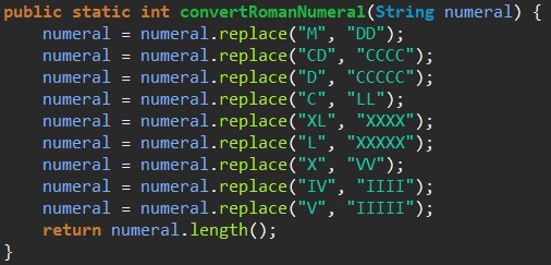 publicstatic int convertRomanNumeral(string n){Map.of("M","DD","CD","CCCC","D","CCCCC","C","LL","XL","XXXX","L","XXXXX","X","VV","IV","IIII","V","IIIII");.forEach((k,v)->{n=n.replace(k,v);});return n.length();}