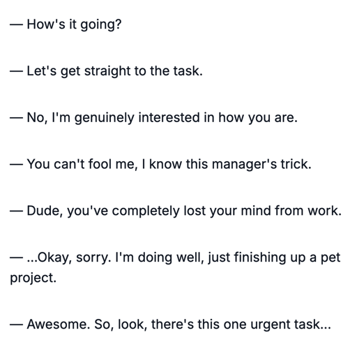 minus-squareAtlas_@lemmy.worldlinkfedilinkarrow-up5·14 days agoOr say “ok, you got me there. But, two things can be true and I’m here to listen if you have something you want to talk about”