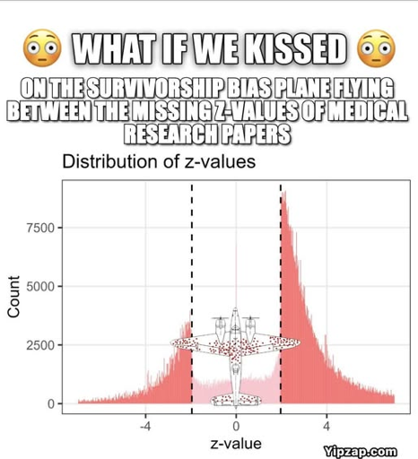 The survivorship bias plane shows a world war 2 chart of where the bullet holes were on planes. The conclusion famously isn’t to armor those parts often hit, but to armor the parts that weren’t hit, because no planes hit there returned to be recorded.