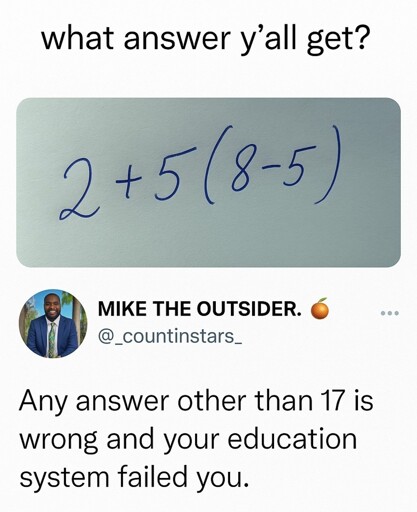 Okay then, but, fun story, the BODMAS they’re talking about is also just PEMDAS using different words and a different listed order for multiplication/division, with the understanding that it’s more properly PE(MD)(AS)