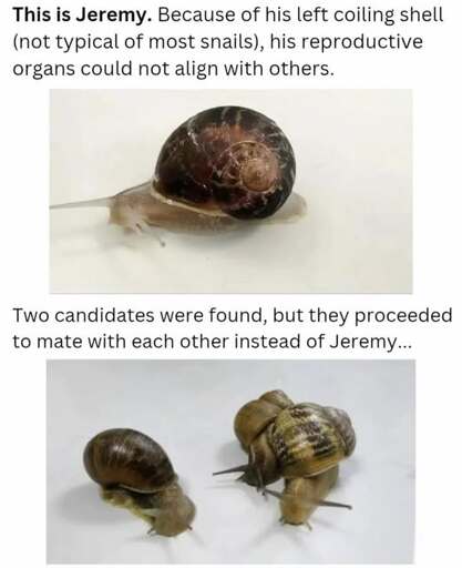 minus-squarefizzle@quokk.aulinkfedilinkEnglisharrow-up5·1 month agoNo, you’re thinking of clockwise vs counter clockwise. As the shell spirals around itself, it does not create a flat disk. Rather, it creates a cone shape. If Jeremy was pointed North, the point of his cone would point to the west, while most other snails would point east. You can see it in the photo on this post.