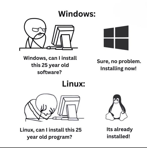 You’re interested in backwards compatibility on servers, and in backwards compatibility for a subset of applications. Cool. Convenient for you! Recognise that there’s more to it than that, that when people meme about how awesome Linux is compared to Windows, focusing on servers and non-graphical applications isn’t good enough.