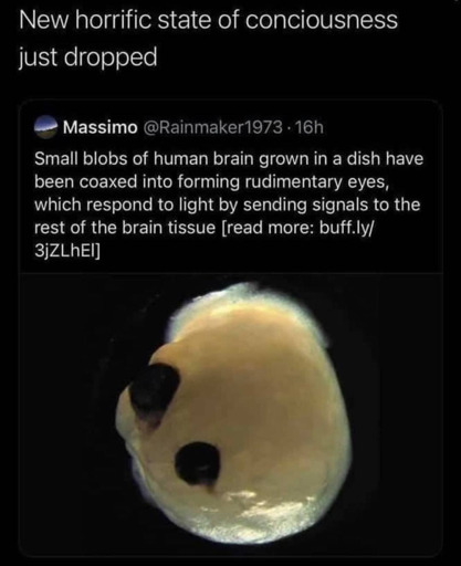 There’s also the question of why would it experience horror? It’s not exactly in pain, and they way they make the eyes grow is just to add the hormone signal that makes eyes grow when developing.