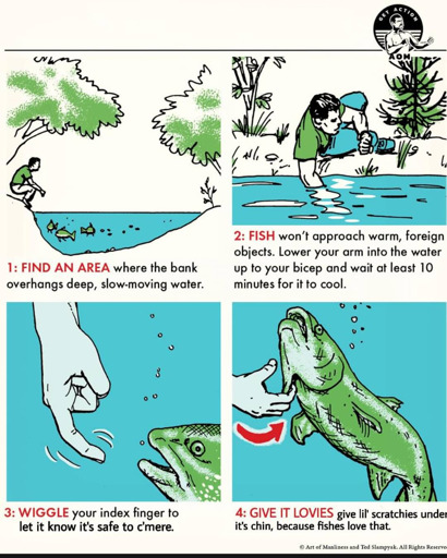 similar with catfish, but you can get bit with those. i think it’s called noodling