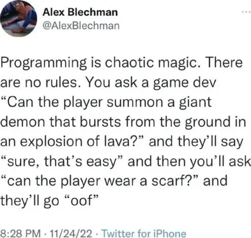 Exactly, the first request is so vague that you can just implement it in a way that doesn’t require any complicated programming magic, but a scarf has the implicit expectation to swing around and not intersect with the player or itself. Or worse, expect the player to summon a demon wearing a scarf!