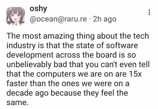 For one thing, it’s one of those tropes that people have been saying for 30 years, so it kinda stops making sense after a while. For another, the reason it doesn’t make sense is it doesn’t account for modern computers doing more now than they did then.